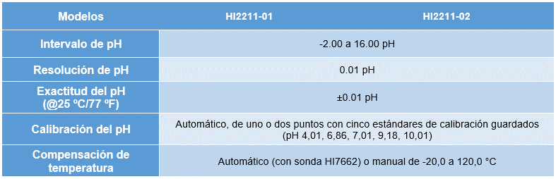 El HI2211 es un medidor de pH y °C de mesa exacto y económico. El HI2211 también se puede utilizar para medir el Potencial de Oxidación Reducción (ORP) en el modo de mV. El proceso de calibración incluye una guía paso a paso a través de gráficos que se muestran en la pantalla LCD. Diseñados para ser fáciles de usar, estos instrumentos cuentan con un indicador de estabilidad de lectura utilizado durante la calibración y una función de recuperación de mediciones. Las mediciones de pH se compensan por el efecto de la temperatura de forma manual o automática con la sonda de temperatura HI7662. Estos instrumentos también cuentan con una pantalla LCD de fácil lectura que muestra tanto la lectura principal como los °C.