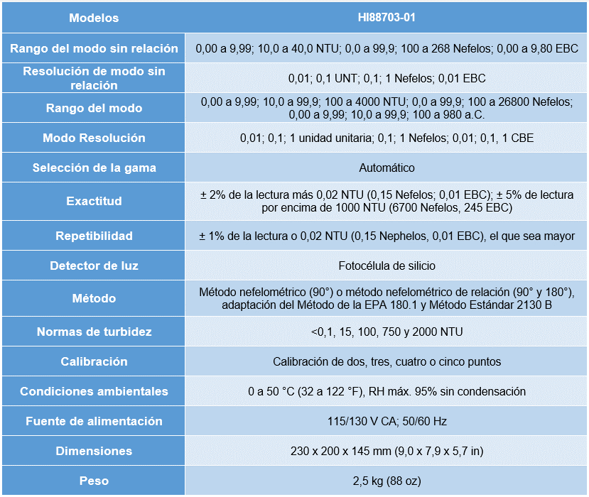 El medidor de mesa de precisión de alta precisión HI88703 está especialmente diseñado para mediciones de calidad del agua, proporcionando lecturas fiables y precisas, especialmente en el rango de baja turbidez. El instrumento se basa en un sistema óptico de vanguardia que garantiza resultados precisos, asegura estabilidad a largo plazo y minimiza las interferencias de luz y color dispersas. La calibración periódica con los estándares suministrados compensa cualquier variación en la intensidad de la lámpara de tungsteno. Las cubetas redondas de 25 mm de vidrio óptico especial garantizan la repetibilidad de las mediciones de turbidez.