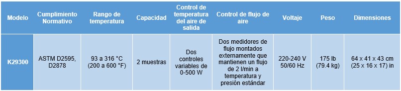 Realiza pruebas de pérdida por evaporación en grasas lubricantes a temperaturas de hasta 316 °C (600 °F). Mantiene la temperatura de la muestra dentro de ±0,3 °F mientras pasa aire caliente sobre la superficie de la muestra a un caudal controlado. Consta de celdas de evaporación y horno de bloque de aluminio con controles para la temperatura de la muestra, la temperatura del aire y el caudal de aire. Las celdas de evaporación incluyen un recipiente para muestras de grasa, un cabezal, un tubo de educción, una cubierta y un tubo de termopar. El horno de bloque de aluminio proporciona una respuesta eficiente y un funcionamiento seguro a altas temperaturas. El control de temperatura por microprocesador tiene un punto de ajuste digital conmutable en °C/°F y una pantalla. El operador y el equipo están protegidos por un circuito de control de sobretemperatura que interrumpe automáticamente la alimentación de la unidad cuando la temperatura del baño supera un punto de corte programado. El control PID por microprocesador proporciona una rápida estabilización de la temperatura sin sobrepasarla y el baño está protegido por un circuito de control de sobretemperatura que interrumpe la alimentación si la temperatura del baño supera un punto de corte programado. Las pantallas LED dobles proporcionan valores de temperatura reales y de punto de ajuste en formato °C/°F. Los controles de precalentador de aire y caudalímetros separados para cada celda permiten un control preciso del flujo de aire calentado hacia la superficie de la muestra. Solicite el termómetro digital (n.° de cat. K29310) como accesorio para monitorear la temperatura del aire de salida y el termómetro ASTM 3F o 3C para la temperatura del bloque (muestra). La copa de muestra de aceite (n.° de cat. K29530) como accesorio convierte la celda de evaporación para muestras de aceite lubricante.