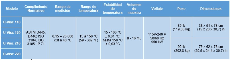 El Omnitek U-Visc es la próxima generación de sistemas de viscosimetría completamente automáticos. El sistema combina varias características únicas, lo que lo convierte en el instrumento de elección en muchas aplicaciones, que van desde el control de calidad hasta la investigación y el desarrollo y el análisis de aceite usado. Si bien ofrece un cumplimiento total con ASTM D445/D446, los tubos de viscosímetro especialmente diseñados cubren un rango de 100 veces, por ejemplo, de 1 a 100 mm2/s. Los tubos se basan en el conocido y probado diseño Ubbelohde, pero solo requieren de 8 a 16 ml de muestra y aproximadamente de 12 a 15 ml de solvente para la limpieza. Disponible con limpieza con uno o dos solventes, el instrumento mide la viscosidad cinemática en fluidos newtonianos como lubricantes, combustibles o plásticos disueltos entre 0,15 y 25 000 mm2/s.