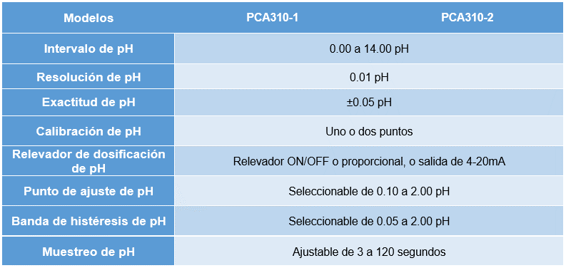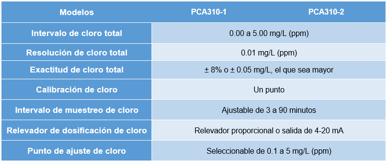 El operador puede ajustar cuatro niveles de cloro: un punto de ajuste para control proporcional, dos valores de alarmas y un nivel mínimo de dosificación. También puede ajustar 3 valores de pH: un punto de ajuste para la dosificación y dos valores de alarmas. Para la temperatura y el ORP, todas las alarmas se pueden activar o desactivar.