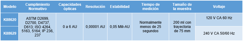 Determina el número de octano de la bomba (AKI), el número de octano de investigación (RON) y el número de octano del motor (MON) de gasolina sin plomo, gasolina mezclada con etanol, gasolina con plomo y el número de cetano para combustibles diésel.