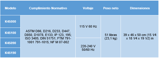 Aparato de destilación de vista frontal, grupos 1, 2 y 3: cumple con todas las especificaciones ASTM y relacionadas para la destilación de gasolinas para motores y aviación, combustibles para turbinas de aviación, naftas, querosenos, combustibles destilados, gasolina natural, mezclas de hidrocarburos líquidos y otros productos derivados del petróleo. Consta de unidades de condensador y calentador de acero inoxidable completamente aisladas. La unidad de calentador incluye una plataforma de soporte de matraz, una ventana de visualización, un calentador de 1250 W con control variable continuo y un mecanismo de elevación del calentador de piñón y cremallera con perilla de control de giro y empuje. Pregunte por calentadores de mayor potencia. El fondo blanco del matraz receptor facilita la visualización de las fracciones durante la prueba. Disponible con unidad de calentador de mano derecha o izquierda para un emparejamiento conveniente. Incluye bloque de soporte graduado y placas de soporte de matraz.