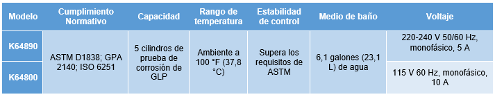 Un baño de agua con temperatura controlada sumerge cinco cilindros de prueba de corrosión de GLP en posición vertical. Controla la temperatura a 100 ± 1°F (37,8 ± 0,5°C) según las especificaciones ASTM. Pared interior de acero inoxidable pulido y pared exterior de acero con recubrimiento en polvo totalmente aislado.