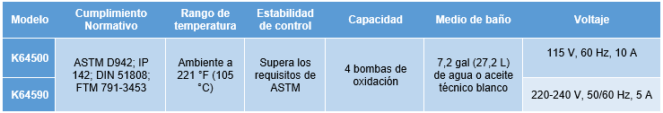 El baño de aceite a temperatura constante mantiene las bombas a la profundidad adecuada para determinar la estabilidad a la oxidación de las grasas lubricantes. El controlador de pantalla táctil completamente digital proporciona una estabilización rápida de la temperatura sin sobrepasarse, y el baño está protegido por un circuito redundante de control de sobretemperatura que interrumpe la energía si la temperatura del baño excede un corte programado punto de partida. La pantalla proporciona valores de temperatura de referencia reales en formato °C/°F. El interior del baño de acero inoxidable soldado, fuertemente aislado, tiene una rejilla de soporte para bombas y un tubo vertical/desagüe de desbordamiento para mantener la profundidad de trabajo adecuada. El exterior de acero tiene un acabado de esmalte de poliuretano resistente a la corrosión.
