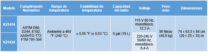Baño de temperatura constante con función de cronometraje automático para determinaciones de viscosidad utilizando tubos y orificios de viscosímetro Saybolt. Con solo presionar un botón, el cronómetro automático inicia el flujo de muestra, detecta el punto final de 60 ml y registra y muestra digitalmente el tiempo de eflujo con una resolución de 0,1 segundos con una precisión del 0,05 %. El cronometraje automático mejora la precisión y la comodidad de las pruebas, ya que elimina el conjunto de cadena y corcho y la necesidad de cronometrar manualmente cada muestra. La instalación del cronómetro está disponible en cualquier configuración de 1 a 4 posiciones. El interior del baño aislado está construido completamente de acero inoxidable de gran calibre. Un tubo de desbordamiento incorporado y una válvula de drenaje simplifican el llenado del fluido del baño hasta el nivel adecuado. La placa superior resistente a los productos químicos proporciona un excelente aislamiento y se quita fácilmente para permitir la limpieza del interior del baño. Se proporciona un serpentín de enfriamiento para agua del grifo o refrigerante refrigerado para el funcionamiento a temperaturas cercanas a la ambiente. El gabinete de acero tiene patas niveladoras y un acabado de poliuretano epoxi resistente a los productos químicos.