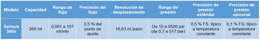 La bomba de jeringa 260x proporciona un control de presión y flujo preciso y predecible a velocidades de flujo desde submililitros hasta 107 ml/min. Su excepcional estabilidad a bajo flujo de hasta 9500 psi (655 bar) hace que esta sea la bomba ideal para aplicaciones de alta presión, desde análisis de núcleos de pozos profundos hasta bombeo de gases licuados.