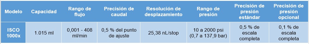 La bomba de jeringa 1000x de Teledyne ISCO proporciona caudales precisos y repetibles de una amplia variedad de fluidos. Este modelo tiene una capacidad de volumen de 1 litro, caudales de hasta 408 ml/min y presiones de hasta 2000 psi (138 bar). Los puertos de lavado de cilindros son estándar para proteger los sellos de los depósitos.