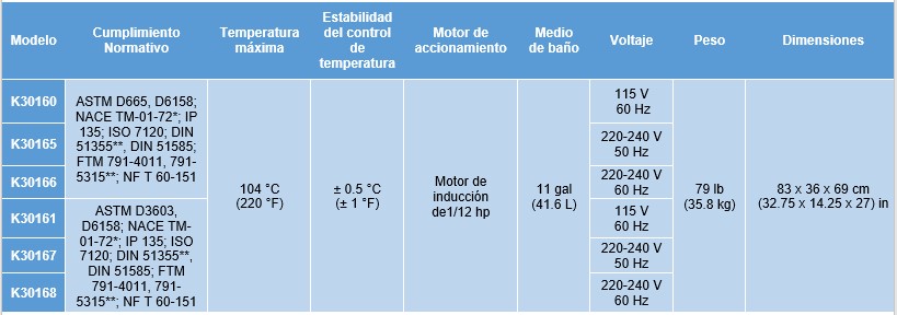 Baño de temperatura constante con agitadores para pruebas de características de prevención de óxido. Agita mezclas de muestra y agua a 1000 rpm y controla la temperatura con una estabilidad de ± 0,5 °C (± 1 °F). Sumerge los vasos de prueba a la profundidad adecuada según las especificaciones ASTM. El control PID por microprocesador proporciona una rápida estabilización de la temperatura sin sobrepasarla y el baño está protegido por un circuito de control de sobretemperatura que interrumpe la energía si la temperatura del baño excede un punto de corte programado. Las pantallas LED dobles proporcionan valores de temperatura reales y de punto de ajuste en formato °C/°F. Las paletas agitadoras de acero inoxidable son impulsadas por un motor de tipo cojinete de bolas a través de una disposición mejorada de cojinetes de rodillos de transmisión por polea. Las paletas se pueden subir y bajar para colocar los vasos de muestra en el baño. Incluye muestras de prueba, soportes y tapas para vasos de precipitados para pruebas ASTM D665 o D3603 (consulte las especificaciones y la información para pedidos). El baño de acero inoxidable incluye un estante de soporte perforado para vasos de precipitados y una placa de cubierta de dos posiciones que se ajusta para pruebas ASTM D665 o D3603. La correa de transmisión de poliéster de larga duración mejora la confiabilidad. Los componentes del tren de transmisión están protegidos por una protección de acero extraíble. Todas las superficies exteriores tienen acabados de acero inoxidable o esmalte de poliuretano resistente a los productos químicos.