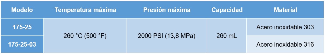 Las celdas para horno OFITE están disponibles en tamaños de 260 ml y 500 ml y utilizan sellos de junta tórica de Viton® y Teflon®. Las celdas de envejecimiento suelen estar construidas de acero inoxidable (grado 303 o grado 316) y se utilizan para pruebas de alta temperatura (hasta 500 °F/260 °C).