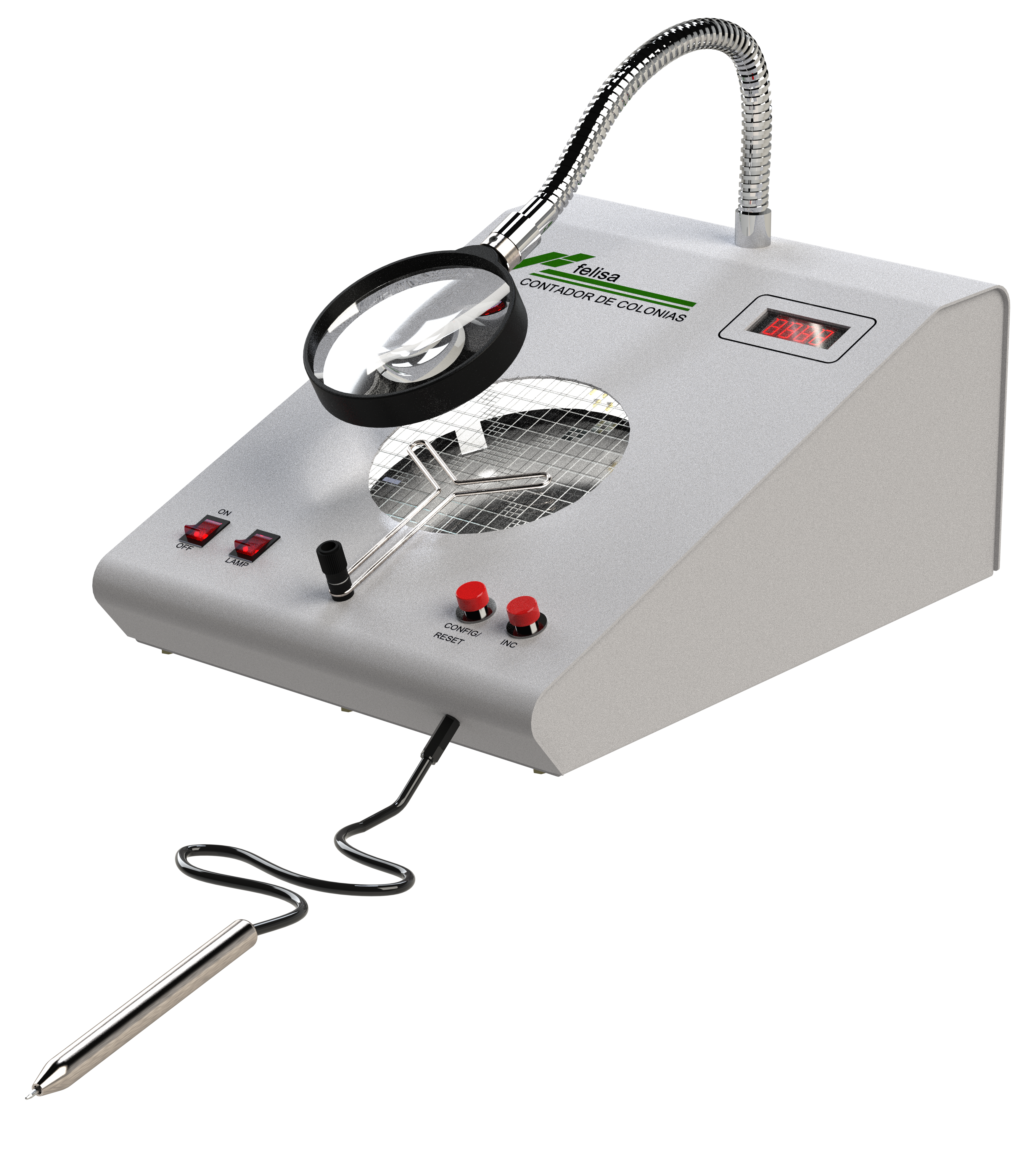 Contador de colonias completo con contador digital, contador tipo pluma y de tecla. Tiene un fondo obscuro para la fácil visualización de colonias e incluye un fondo claro para colonias con tinción. Cuenta con iluminación indirecta por una lámpara fluorescente para no calentar las muestras. Con todo este grupo de accesorios, el modelo FE-500 es la mejor opción del mercado. El contador es automáticamente totalizado en un display de 4 dígitos, los cuales pueden ser puestos a cero de una manera muy sencilla, con protección para evitar puestas a cero erróneas. El contador cuenta con una alarma auditiva configurable para avisar cuando ha capturado un dato y un magnificador de 3X y de 4 pulgadas con brazo flexible que le permitirá posicionarlo en la forma más cómoda para usted. El equipo también cuenta con un dispositivo que le permite ajustar cualquier plato al centro de la malla.