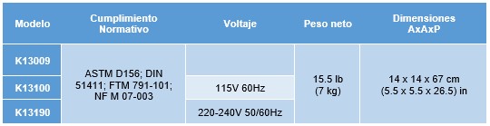 Determina el color Saybolt de productos petrolíferos altamente refinados. Consta de un conjunto combinado de conjuntos de tubos de muestra y estándar con  visor óptico. Compara una muestra del producto a analizar con discos de color estándar bajo una fuente de luz uniforme. La altura de la columna se reduce hasta que el campo de muestra sea más claro que el estándar de color y la altura se convierte al color Saybolt utilizando la tabla del instrumento. La torreta de tres posiciones en el tubo estándar permite cambiar cómodamente las combinaciones de discos de color. La lámpara de luz diurna accesoria (n.º de cat. K13010) proporciona una fuente de luz estándar según las especificaciones ASTM. Para ceras de petróleo, el cromómetro de cera Saybolt está equipado con calentadores para mantener fundidas las ceras que no son fluidas a temperatura ambiente durante la prueba. El tubo de muestra tiene un calentador de tira de acero cromado de 200 W y una  cubierta con bisagras para mantener una distribución uniforme del calor. Un calentador de bloque de aluminio con elemento de cartucho de 50 W mantiene la cera fundida en el conjunto de grifo de drenaje. Se puede utilizar un transformador variable accesorio para regular la temperatura de la muestra. El visor óptico y el soporte están completamente aislados de los calentadores. El conjunto de tubos de muestra tiene asas de fibra resistentes al calor.