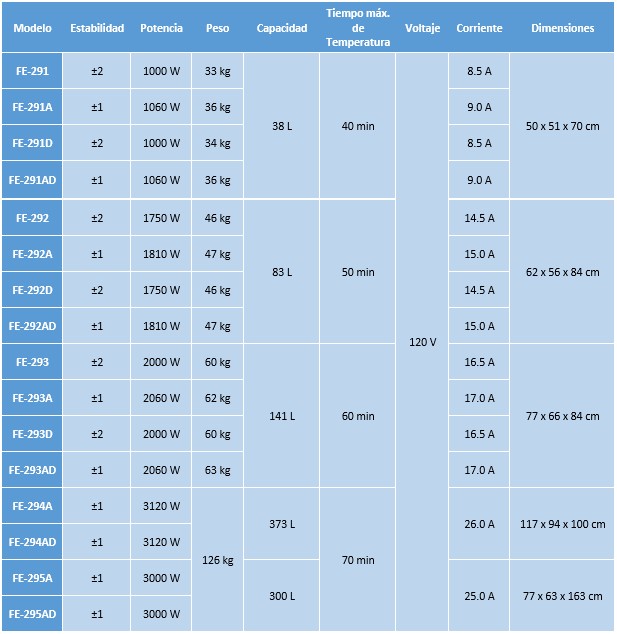 Los hornos tienen numerosos usos dentro del área de laboratorio. Felisa fabrica cinco tamaños con cuatro configuraciones diferentes en convección por gravedad o convección mecánica con regulación de flujo de aire, gabinete interior en acero inoxidable y gabinete exterior en acero terminado con esmalte anticorrosivo. Control de temperatura analógico o control digital microcontrolado, con rango de operación de ambiente de +5° a 250 °C, resolución de 1 °C.