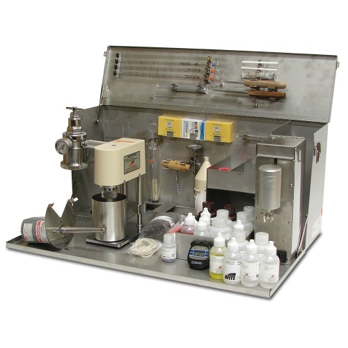 El kit para avión OFITE es el kit portátil de análisis de lodo más completo disponible en el mercado, en un único maletín de acero inoxidable. Contiene todos los elementos del kit para alta mar, además de un cronómetro, un termómetro de metal, un mezclador portátil y reactivos para analizar el contenido de calcio, sulfato, dureza y alcalinidad.