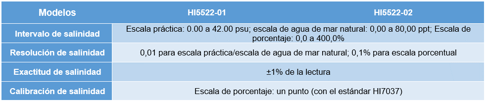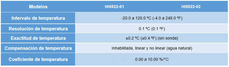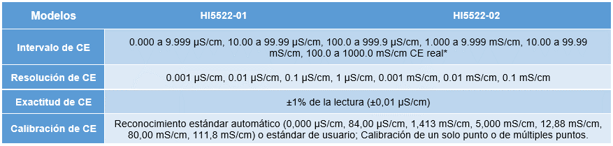 El HI5522 es un medidor de dos canales que permite la medición simultánea de pH, ORP, o ISE en un canal y CE, TDS, salinidad o resistividad en el otro. El canal 1 tiene un conector BNC para utilizarlo con la amplia línea de electrodos de pH, ORP e ISE que ofrece Hanna instruments. El medidor se suministra con el electrodo combinado HI1131B con cuerpo de vidrio, doble unión que opera en un amplio intervalo de temperaturas desde 0 hasta 100 °C. Todas las lecturas se compensan automáticamente por variaciones de temperatura con la sonda de temperatura separada HI766-T o con el sensor de temperatura integrado de la sonda de conductividad en el canal 2. El HI5522 se suministra con la sonda de conductividad de 4 anillos HI76312, que opera en un amplio intervalo que va de los 0.000 μS/cm a los 1,000.0 mS/cm*. El medidor de mesa de pH y conductividad puede colocarse en modo de ajuste de intervalo automático, en el cual el medidor elige el intervalo apropiado de conductividad de siete intervalos disponibles, o puede programar el intervalo fijo en el que el medidor mostrará la lectura en μS/cm o mS/cm. Todas las lecturas se compensan automáticamente por variaciones de temperatura con el sensor de temperatura incorporado. El coeficiente de corrección se ajusta desde 0.00 a 10.00%/°C.