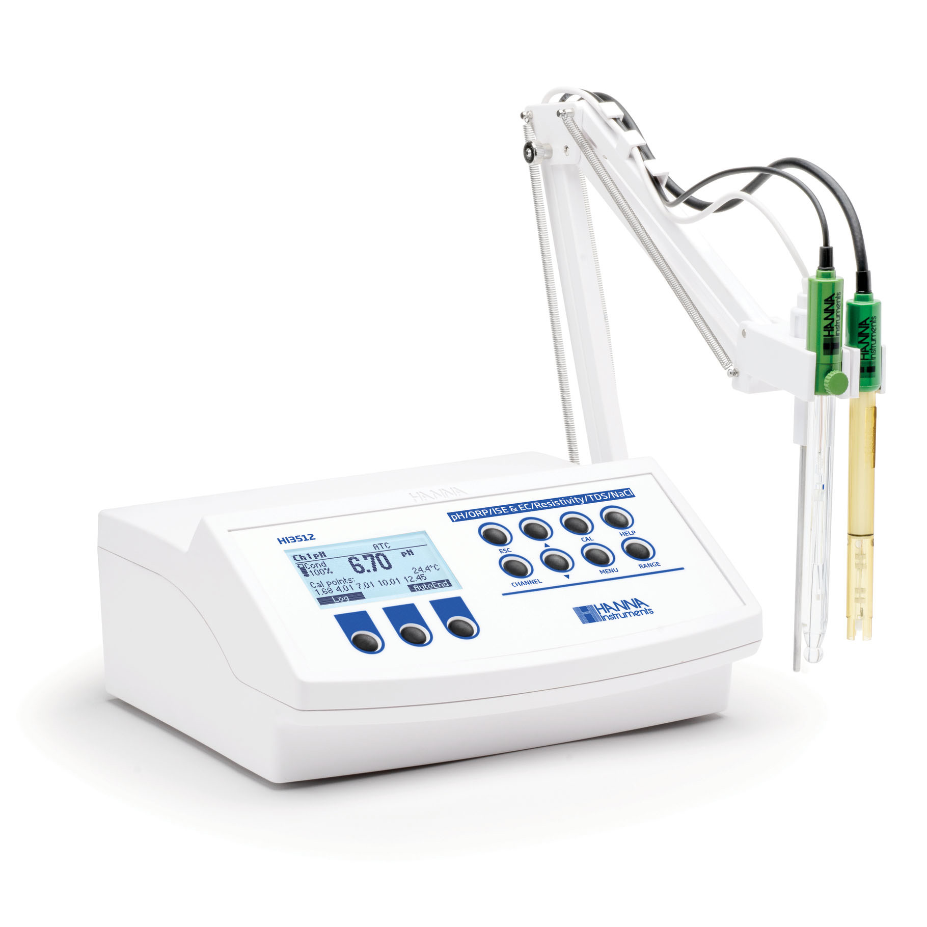 HI3512 es un medidor de mesaprofesional de pH, ORP, ISE, CE, Resistividad, TDS, NaCl y Temperatura de doble entrada con una pantalla LCD gráfica diseñada para proporcionar alta precisión y facilidad de uso tanto en el laboratorio como en condiciones industriales adversas. Este instrumento es un modelo de entrada dual que mide pH, ORP o ISE y temperatura en el canal 1 y CE, resistividad, TDS y salinidad (utilizando una sonda CE) en el canal 2.