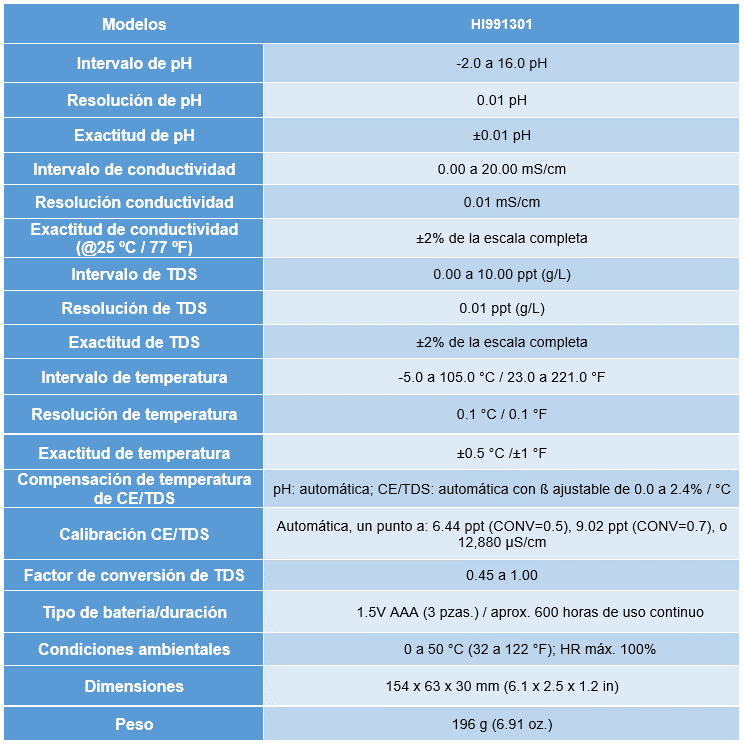 Diseñado para proporcionar simplicidad en las mediciones, el medidor de pH/CE/TDS HI991301 está diseñado para las mediciones en la industria manufacturera y ambiental. La sonda especializada incluye 3 sensores en un solo cuerpo resistente de polipropileno, y tiene sensor de temperatura y unión de tela.