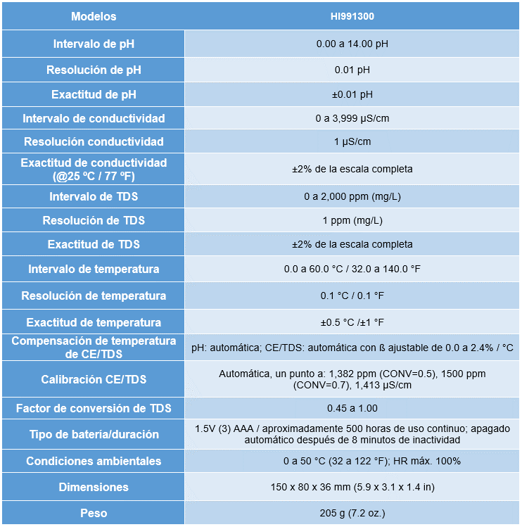Diseñado para proporcionar simplicidad en las mediciones ambientales, el medidor HI991300 para pH/CE/TDS cumple los requerimientos encontrados en los protocolos de medición de procesos de fabricación y ambientales.
