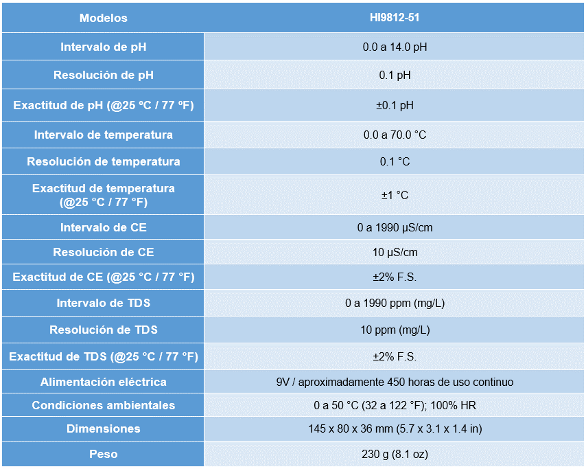 El HI9812-51 es un medidor de pH/CE/TDS para aplicaciones de agricultura, invernadero e hidroponía. Estos medidores cuentan con una gran pantalla LCD que muestra lecturas de pH, CE, TDS o temperatura junto con instrucciones de tutorial. Las lecturas de pH se muestran con una resolución de 0,1 y una precisión de +/-0,1 de pH, mientras que las lecturas de CE y TDS se muestran con una resolución de 10 mS/cm y 10 ppm (mg/L) y una precisión de escala completa del 2%. El coeficiente de corrección de temperatura (β) se fija en 2%/°C y permite mediciones automáticas compensadas por temperatura de EC y TDS. Estos medidores se calibran manualmente a un solo punto con el uso de dos tiempos. El pH está calibrado a pH 7,01 mientras que EC/TDS está calibrado a 1,41 mS/cm (1413 µS/cm) o 1500 ppm.