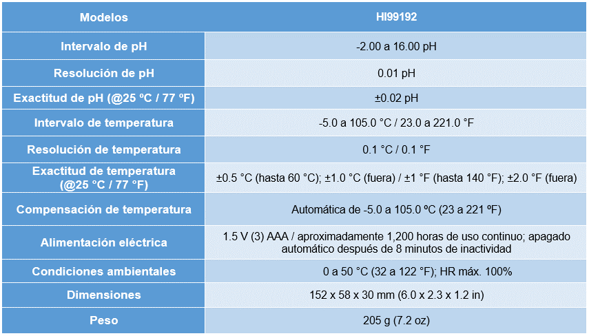 Diseñado para proporcionar simplicidad en las mediciones de pH del agua de consumo humano, el medidor de pH HI99192 está diseñado para mediciones en agua de consumo humano y agua potable. El electrodo especializado FC2153 tiene cuerpo de vidrio, punta esférica y unión triple de cerámica que lo hace ideal para las mediciones de pH en agua de consumo humano y otras muestras de baja fuerza iónica.