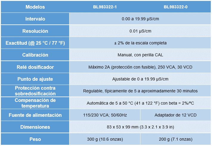 El BL983322 es un controlador de proceso compacto, montado en panel, que mide la conductividad eléctrica (CE) de una corriente de proceso. El dispositivo cuenta con una gran pantalla LCD con cubierta protectora. Los usuarios pueden elegir entre el modo de dosificación automática o manual. Cuando el medidor se encuentra en modo automático, el relé de contacto seco se activa si la lectura está por encima del punto de ajuste. El relé puede utilizarse para activar un solenoide que cambia de un tanque DI (desionizado) a otro o para abrir una válvula que permita que el agua con un valor bajo de CE fluya a un tanque que se está controlando para disminuir su CE. El BL983322 también se puede usar para controlar la calidad del agua de los tanques DI o de un equipo de destilación. El BL983322 mide CE de 0.00 a 19.99 μS/cm.