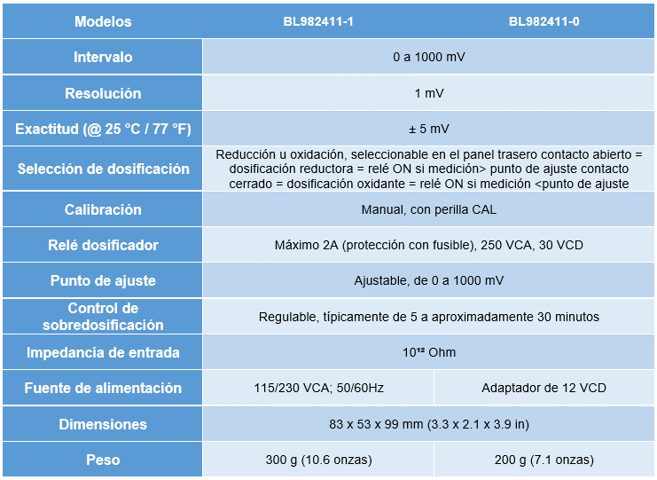 El BL982411 es un controlador de proceso compacto, montado en panel, que mide ORP de una corriente de proceso.
