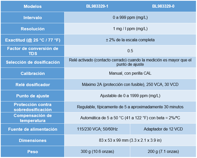 El BL983329 es un controlador de proceso compacto, montado en panel, para medir los sólidos totales disueltos (TDS) en una corriente de proceso que está dentro del intervalo de 0 a 999 ppm (mg/L). Utiliza un factor de conversión de 0.5 en el que 100 μS/cm = 50 ppm.