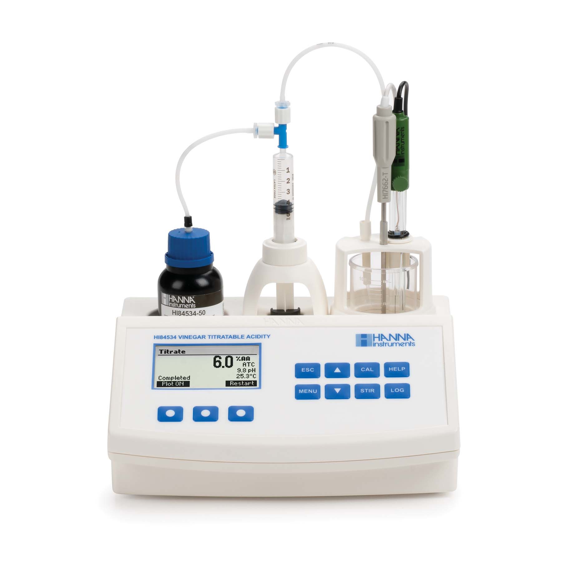 El HI84534 es un minititulador automático y pHmetro fácil de usar, diseñado para el análisis rápido y preciso de la acidez total y pH en vinagre que analiza mediante reacción ácido-base la muestra mostrando el resultado como ácido acético. Es la herramienta perfecta para análisis en vinagre debido a su capacidad para eliminar factores subjetivos que incluyen indicadores de color, errores en los cálculos matemáticos o adiciones erráticas de valoradores.