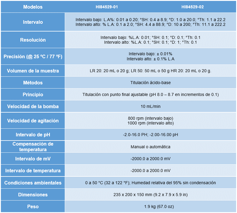 El HI84529 utiliza métodos basados ​​en la AOAC y métodos estándar para el análisis de productos lácteos. Ambos métodos determinan la acidez titulable como ácido láctico en % y se utiliza un factor de conversión para obtener los resultados en otras unidades disponibles. El HI84529 se puede personalizar para cubrir las necesidades de cualquier laboratorio de análisis de productos lácteos. Las muestras pueden ser tituladas utilizando su peso o volumen, diluidas o no diluidas (sólo intervalo bajo) y se titulan a un punto final de pH fijo que puede ser seleccionado por el usuario. El HI84529 ofrece tres métodos diferentes dependiendo del intervalo esperado y del peso de la muestra. Seleccione el intervalo bajo 50 para titular muestras de 50 mL o 50 g sin diluir. Las otras opciones son intervalo bajo 20 e intervalo alto 20 para titular muestras de 20 mL o 20 g que se diluyen dos veces en volumen con agua desionizada o destilada.