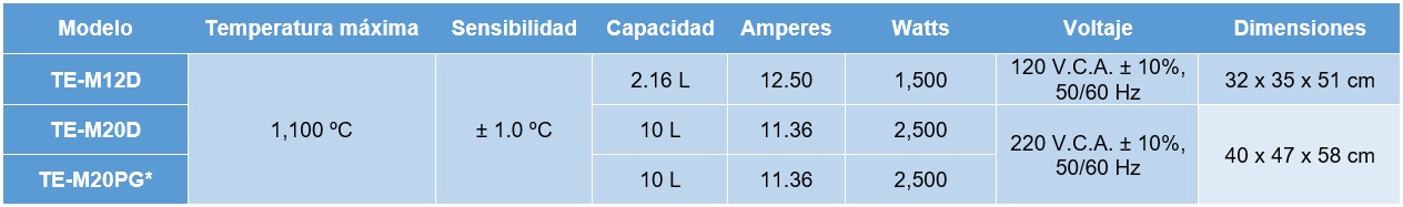 En modelo TE-M20PG*: Pantalla táctil a color de 7 in, visualización de gráficos, con 50 segmentos y 10 recetas programables. Opcional salida a puerto USB para grabar datos a memoria