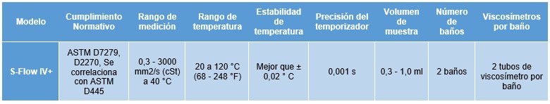 El instrumento S-Flow IV+ consta de sistemas de viscosimetría automatizados, compactos y de sobremesa para el análisis de fluidos newtonianos. Cumple totalmente con las normas ASTM D7279 y ASTM D2270, y ofrece una correlación completa con la norma ASTM D445. Es el sistema ideal para laboratorios de aceite usado que necesitan probar una amplia gama de viscosidades de lubricantes.