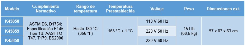 Horno de doble propósito para ensayos de pérdida de calor y de película delgada para  materiales bituminosos y asfálticos. Cámara interior de acero inoxidable y exterior de acero para pintura en polvo almacenada. Ventana de doble acristalamiento en la puerta para ver la cámara de ensayo. Los controles montados en el lateral comprenden control digital por microprocesador, termostato de sobrecalentamiento independiente, interruptor principal y lámparas indicadoras. Se suministran dos plataformas giratorias para realizar ambas pruebas.