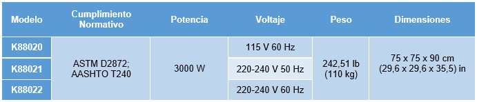 Horno de convección de doble pared calentado eléctricamente para pruebas de hornos de laminación de película fina sobre asfaltos. Incorpora todas las características requeridas según las especificaciones de ASTM, que incluyen: puerta con ventana de visualización de doble panel; rejillas de ventilación superior e inferior simétricas; cámara de aire; ventilador de 1725 rpm tipo jaula de ardilla; termostato indicador digital para controlar la temperatura del horno a 163 ° C ± 0,5 ° C; carro circular vertical para rotar mecánicamente las muestras a 15 ± 0,2 rpm; chorros de aire para soplar aire caliente en cada botella de muestra en su punto más bajo de recorrido; y un caudalímetro calibrado para controlar el flujo de aire a 4000 ml / min. Un circuito de corte por exceso de temperatura desconecta la energía a la unidad en caso de falla del control.