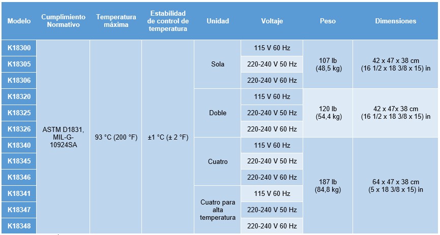 Aparato de estabilidad de rodadura para pruebas de estabilidad de corte en grasas lubricantes. Hace girar cilindros de prueba de acero a 10 o 165 rpm en un entorno controlado por termostato a temperaturas de hasta 93,3 °C (200 °F). El sistema de accionamiento está alimentado por un motor de relación resistente y las ruedas dentadas de la cadena de transmisión intercambiables son de fácil acceso para convertir la unidad a cualquiera de las velocidades de funcionamiento. El control PID por microprocesador proporciona una rápida estabilización de la temperatura sin sobre impulso y está protegido por un circuito de control de sobre temperatura que interrumpe la energía si la temperatura excede un punto de corte programado. Las pantallas LED dobles proporcionan valores de temperatura reales y de punto de ajuste en formato °C/°F. El software de comunicaciones (RS232, etc.), rampa a ajuste y otras características mejoradas están disponibles como opciones de costo adicional.