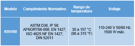 Determina el punto de ablandamiento del betún, utilizando el aparato de anillo y bola sumergido en agua destilada (30 a 80 °C), glicerina USP (por encima de 80 a 157 °C) o etilenglicol (30 a 110 °C).