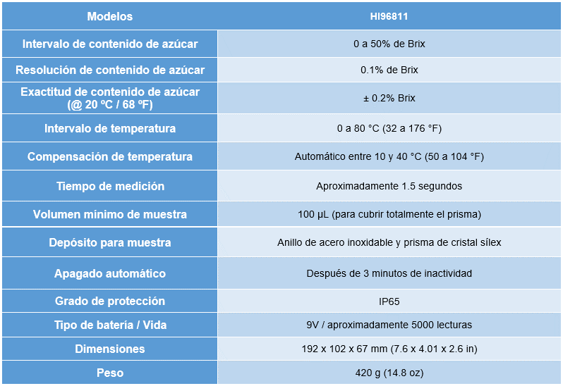 El refractómetro digital HI96811 convierte el índice de refracción de una muestra de jugo o mosto en % Brix. Esta conversión se basa en las tablas del estándar ICUMSA (Comisión Internacional de Métodos Estándar de Análisis de Azúcar) que documenta los cambios en el índice de refracción con la temperatura para una solución de sacarosa en porcentaje peso. Dado que la mayoría del azúcar en el jugo de uva y el mosto es fructosa y glucosa en lugar de sacarosa, la lectura se denomina “Brix aparente”. Las uvas típicas en la cosecha estarán entre 19-24% Brix o grados Brix ( ° Bx). El HI96811 es un medidor fácil de usar para los enólogos que les permite medir el azúcar en uvas o mosto, en el campo o en el laboratorio.