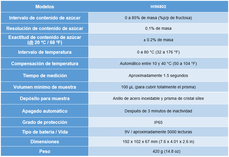 El refractómetro digital de fructosa HI96802 convierte el índice de refracción de una muestra en % peso de fructosa. Esta conversión se basa en las tablas encontradas en el estándar ICUMSA (Comisión Internacional de Métodos Estándar para Análisis de Azúcar) que documenta los cambios en el índice de refracción con la temperatura para un porcentaje en peso de solución de fructosa. El HI96802 es ideal para el análisis de frutas, bebidas energéticas, pudines, leche de soya, jugos, mermeladas, miel, sopas, jaleas, tofu y condimentos. El HI96802 es una equipo fácil de usar para medir el azúcar en muestras de alimentos, ya sea en el campo o en el laboratorio.
