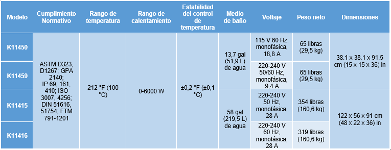 Prueba hidrostática (tipo de dos aberturas): Soporta una presión hidrostática manométrica de 1000 psi (6894 kPa) según las especificaciones ASTM D1267. Cilindros de prueba de acero inoxidable pulido para pruebas de presión de vapor de productos de petróleo líquido, petróleo crudo volátil y gas licuado de petróleo (GLP). Consta de una cámara superior y una cámara inferior en la relación de volumen requerida de 4:1. Las juntas tóricas proporcionan un sellado hermético entre las cámaras y en el acoplamiento del manómetro. El tipo de una abertura es para gasolina y otros productos que tienen una presión de vapor Reid por debajo de 26 psi (180 kPa). El tipo de dos aberturas es para productos líquidos que tienen una presión de vapor Reid por encima de 26 psi (ASTM D323) y para GLP (ASTM  D1267). La cámara inferior del aparato de dos aberturas incluye una válvula de bola de paso recto y una válvula de aguja de 1⁄4 in.