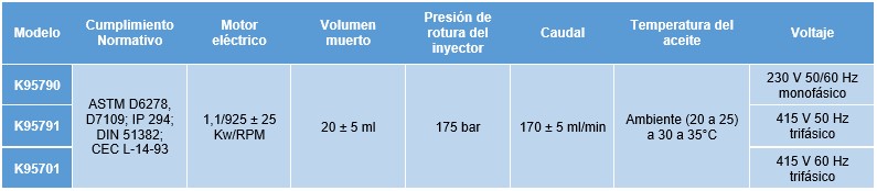 El aparato consta de un depósito de fluido, una bomba de doble émbolo accionada por un motor eléctrico, una cámara de atomización con una boquilla de pulverización de inyector diésel y un recipiente de refrigeración de fluido, instalado en un área con una temperatura ambiente de 20 a 250 °C. El depósito de fluido está abierto en la parte superior, tiene una capacidad aproximada de 250 ml, un diámetro interior de 45 mm y está calibrado en unidades de volumen. Está equipado con un distribuidor de fluido interno. Un vidrio de reloj de 40 mm de diámetro con bordes dentados es una placa distribuidora aceptable. El distribuidor reduce la tendencia a la canalización del fluido. La temperatura se mide mediante un termómetro suspendido en el centro del depósito de fluido. La parte inferior del bulbo del termómetro debe estar de 10 a 15 mm por encima de la entrada de la abertura del tubo de drenaje. También se puede utilizar otro equipo de medición de temperatura ubicado en la misma ubicación. La salida está equipada con una llave de paso de tres vías. La llave de paso de tres vías es de tipo cónico con un tapón sólido no intercambiable con un diámetro interior nominal de 8 mm. Se utiliza un tubo de plástico transparente para conectar la llave de paso de tres vías a la entrada de la bomba.