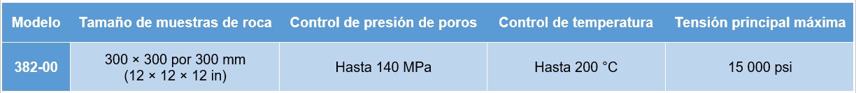 El RPS-600 está diseñado para probar muestras cúbicas de 12 x 12 x 12 in y tiene la capacidad de aplicar tensiones ortogonales en cada una de las tres direcciones principales. La tensión principal máxima es de 15 000 psi. Este sistema proporciona un control independiente de las tres tensiones principales. Se pueden aplicar presiones hidráulicas para fracturar muestras de roca en el centro de la muestra cúbica mientras se controlan las tres tensiones principales. También se proporciona un segundo puerto de presión para medir las presiones de poro de la muestra. La velocidad ultrasónica se puede medir en cualquier dirección ortogonal, así como las emisiones acústicas mientras se aplican tensiones de prueba y presiones de fracturación hidráulica. También se incluye un software de ubicación de eventos tridimensional.