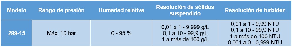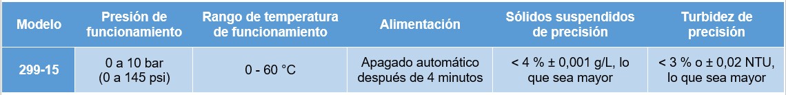 Instrumento compacto para determinación analítica en modo de medición continua con ajuste de tiempo de integración. Ajuste de hasta 5 puntos de medición, almacenamiento de valores de medición con nombre, fecha y hora. A prueba de golpes. Método combinado de luz alternada de múltiples haces con sistema de diodo infrarrojo y enfoque de haz; longitud de onda 860 nm. Los rangos de medición para turbidez y sólidos en suspensión son: 0,001 – 9999 FNU y 0,001 – 400 g/L respectivamente.