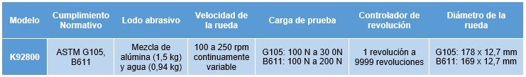 El banco de pruebas Koehler K92800 está diseñado de tal manera que una muestra estándar se presiona contra una rueda de goma con una fuerza conocida. El área de prueba se sumerge en una suspensión abrasiva húmeda. La rueda lleva partículas de agarre a través de la cara de contacto en la dirección de rotación de la rueda. Se utiliza una dureza de durómetro de 50, 60 y 70 con una tolerancia de dureza de ± 2,0. Se realiza un rodaje con la rueda de durómetro de 50 seguido de la prueba con las ruedas de durómetro de 50, 60 y 70 en orden de dureza creciente. Las muestras se pesan antes y después de cada rodaje y se registra la pérdida de masa. Los logaritmos de la pérdida de masa se grafican como una función de la dureza de la rueda de goma medida y se determina un valor de prueba a partir de una línea de mínimos cuadrados como la pérdida de masa a 60,0 durómetro. Es importante convertir la pérdida de masa en pérdida de volumen, debido a las amplias diferencias en la densidad de los materiales, para obtener una clasificación de los materiales. La abrasión se informa luego como pérdida de volumen en milímetros cúbicos.