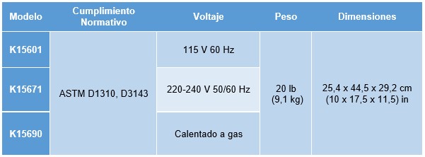 Para la determinación de puntos de inflamación y de combustión de líquidos a temperaturas de hasta 163 °C (325 °F) y puntos de inflamación de asfaltos diluidos a temperaturas inferiores a 93 °C (200 °F).