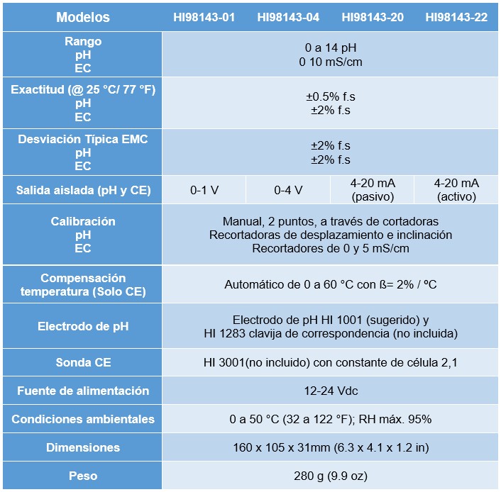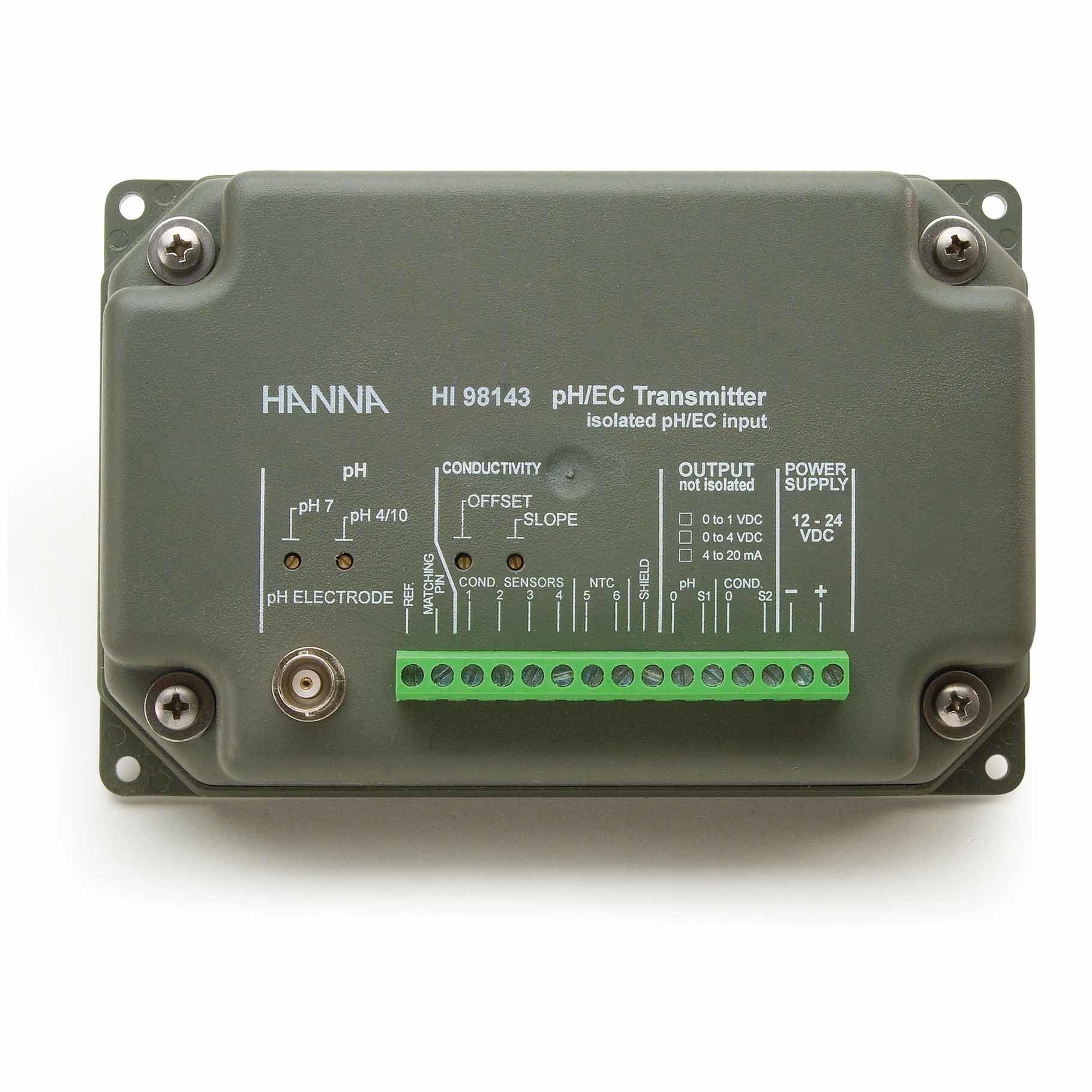 El HI 98143 es un transmisor de pH y CE montado en panel especialmente diseñado para aceptar señales directamente de un electrodo de pH y sonda de conductividad al mismo tiempo. Las conexiones directas de las sondas al transmisor garantizan una conexión eléctrica positiva sin pérdida de señal. Hay cuatro modelos disponibles, que transmiten una señal de 0-1 V, 0-4 V o 4-20 mA. Las señales de salida son proporcionales a las de entrada, pero independientes de los cambios en la carga o la capacitancia del cable.